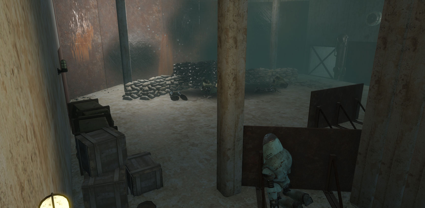 This small area was not planned, but it was pretty successful. If we divide players of Fallout 4 into two very broad archetypes, shooters and readers, both player types managed to enjoy this section. The shooters enjoyed a small 'boss fight', and the readers gained the opportunity to read into the situation and learn about this area. Based on playtesting I've done with this mod, I believe this to be an accurate statement.