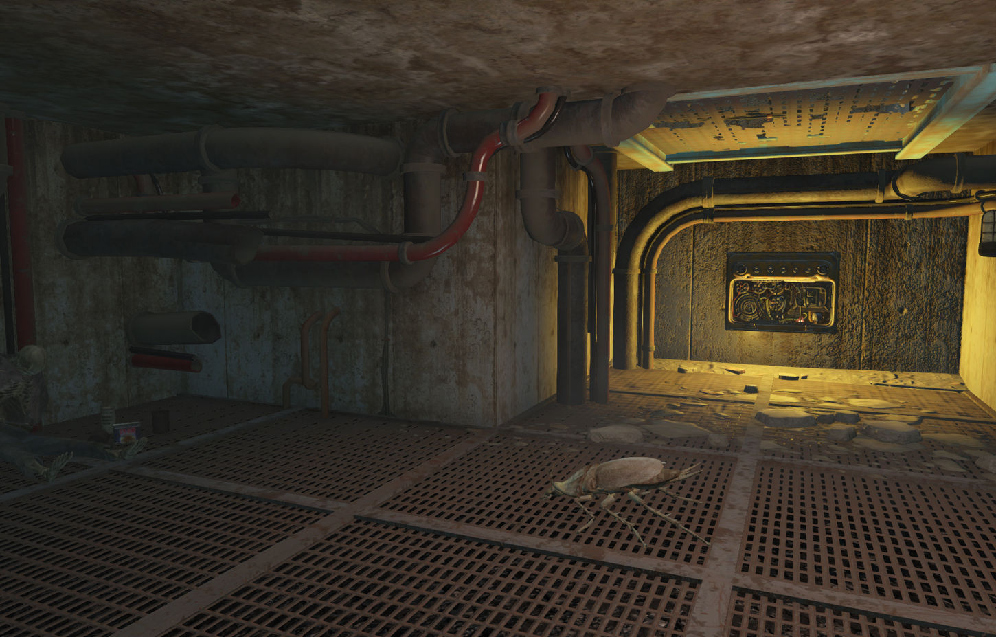 I also added some simpler changes. Like in the first iteration of this mod I left a few small stories of dead soldiers around. The skeleton in the pictures above is of an engineer that was trapped in maintenance tunnels as the bombs fell. I also added in some more subtle assets to give life t the space and the characters that would have lived here. Since this is a power armor testing facility, I gave the engineers tiny little power armor suits that look like action figures. While this is a military facility small changes such as this breathed a lot of life into the space.